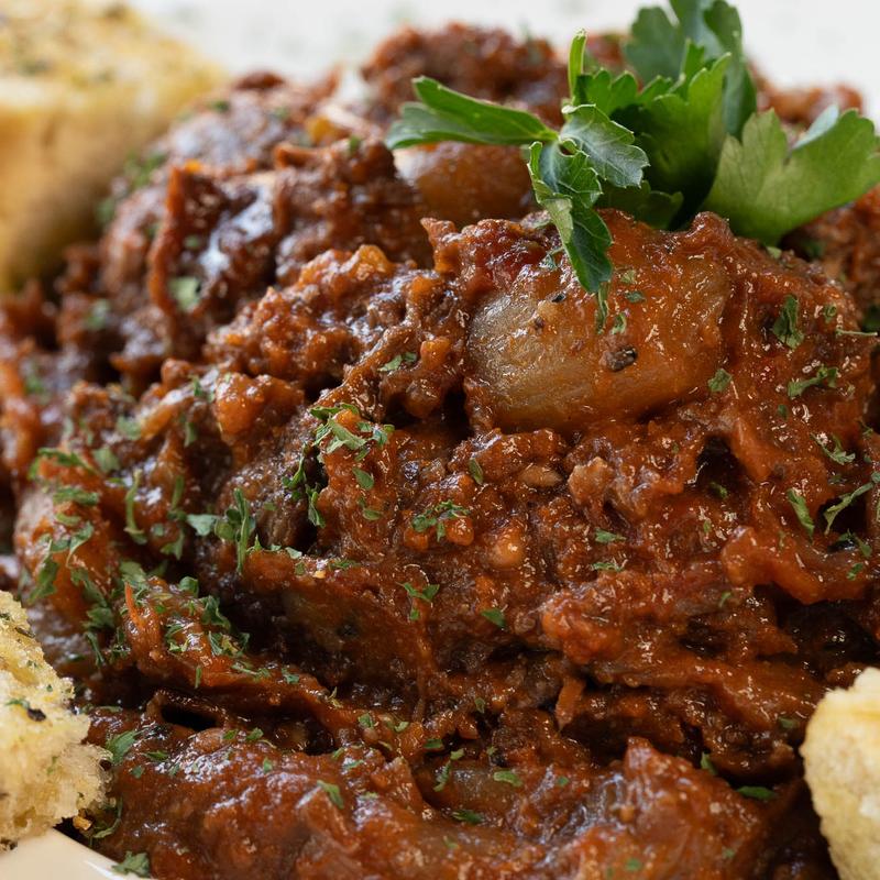 Braised beef, stewed with onions and tomatoes, served atop a bed of orzo.