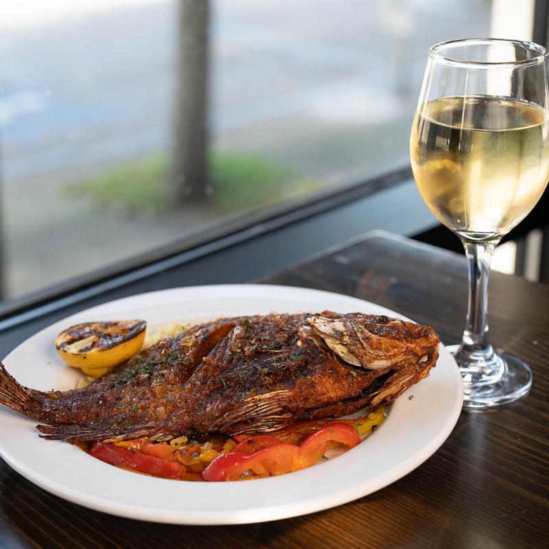 Fried whole fresh fish, dressed with extra-virgin olive oil and fresh lemon juice, served with roasted vegetables over a bed of orzo.